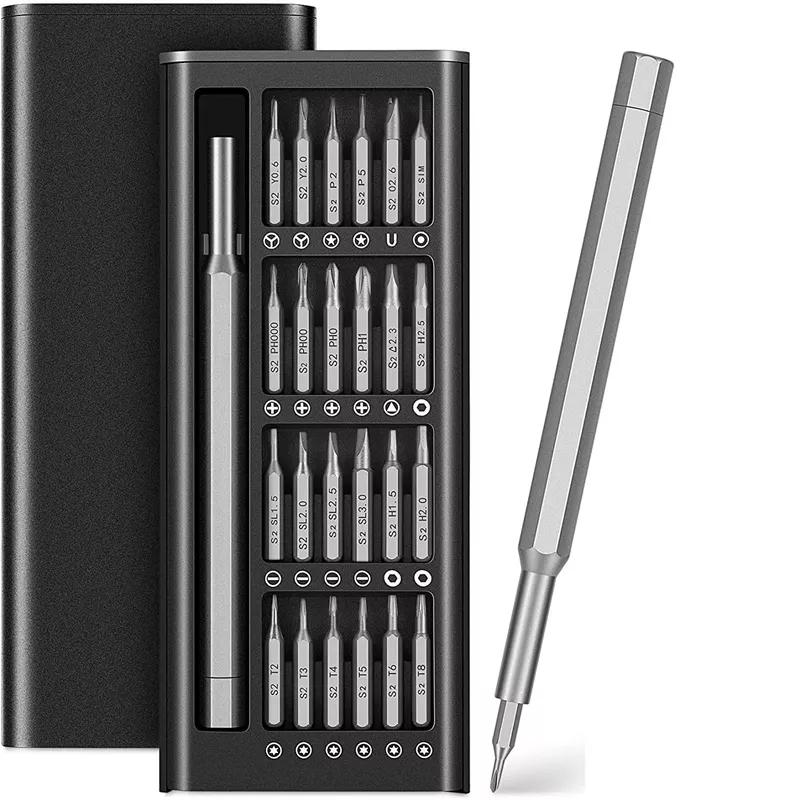 Introducing our 24-in-1 Magnetic Precision Screwdriver Set, the ultimate toolkit for every DIY enthusiast and professional fixer. This premium set features an ergonomic handle paired with 24 different sizes of magnetic precision bits, including Torx, Slotted, Phillips Head, Hex, Tri-wing, Pentalobe, U-Sharp, Triangle head, and Mainboard Phillips, ensuring you have the perfect tool for every intricate repair job.