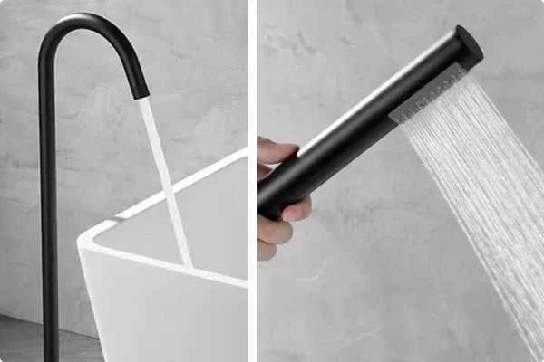 Embrace the fusion of luxury and practicality with our freestanding bathtub faucet. Its dual handle design ensures precise control over water temperature, while the inclusion of a handheld shower offers flexibility, whether rinsing off after a bath or cleaning the tub. The contemporary design, paired with the matte black finish, suits any modern bathroom, making it a versatile addition to your home.